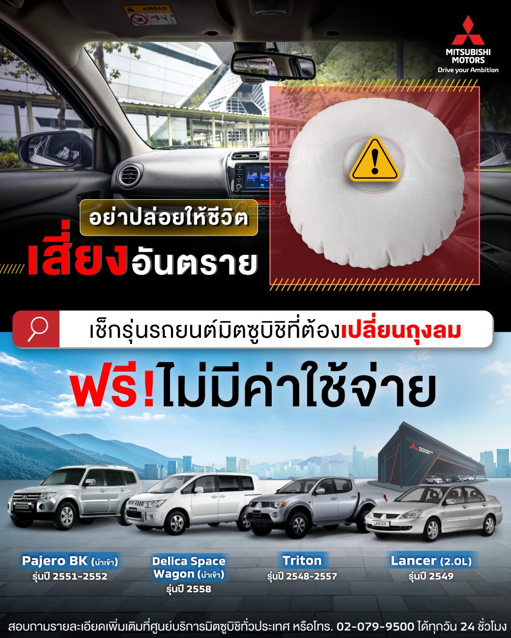 พลาดครั้งเดียว อาจเสี่ยงถึงชีวิต ตรวจสอบให้ชัวร์ รถยนต์มิตซูบิชิของคุณเข้าข่ายต้องเปลี่ยนถุงลมหรือไม่ เพื่อความปลอดภัยของคุณและคนที่คุณรัก เช็กเลยวันนี้! รถยนต์มิตซูบิชิของคุณ เข้าข่ายต้องเปลี่ยนถุงลมหรือไม่ เปลี่ยนฟรี! ไม่มีค่าใช้จ่าย ที่ศูนย์บริการมิตซูบิชิทั่วประเทศ สำหรับรถยนต์มิตซูบิชิรุ่นต่างๆ ดังนี้– มิตซูบิชิ ปาเจโร BK (รถยนต์นำเข้า) รุ่นปี 2551 – 2552– มิตซูบิชิ เดลิก้า สเปซวากอน (รถยนต์นำเข้า) รุ่นปี 2558– มิตซูบิชิ ไทรทัน รุ่นปี 2548 – 2557– มิตซูบิชิ แลนเซอร์ (2.0L) รุ่นปี 2549 หรือตรวจสอบได้ที่ http://mmth.site/46iZ9lm เพียงกรอกหมายเลขตัวถังรถยนต์ของคุณ