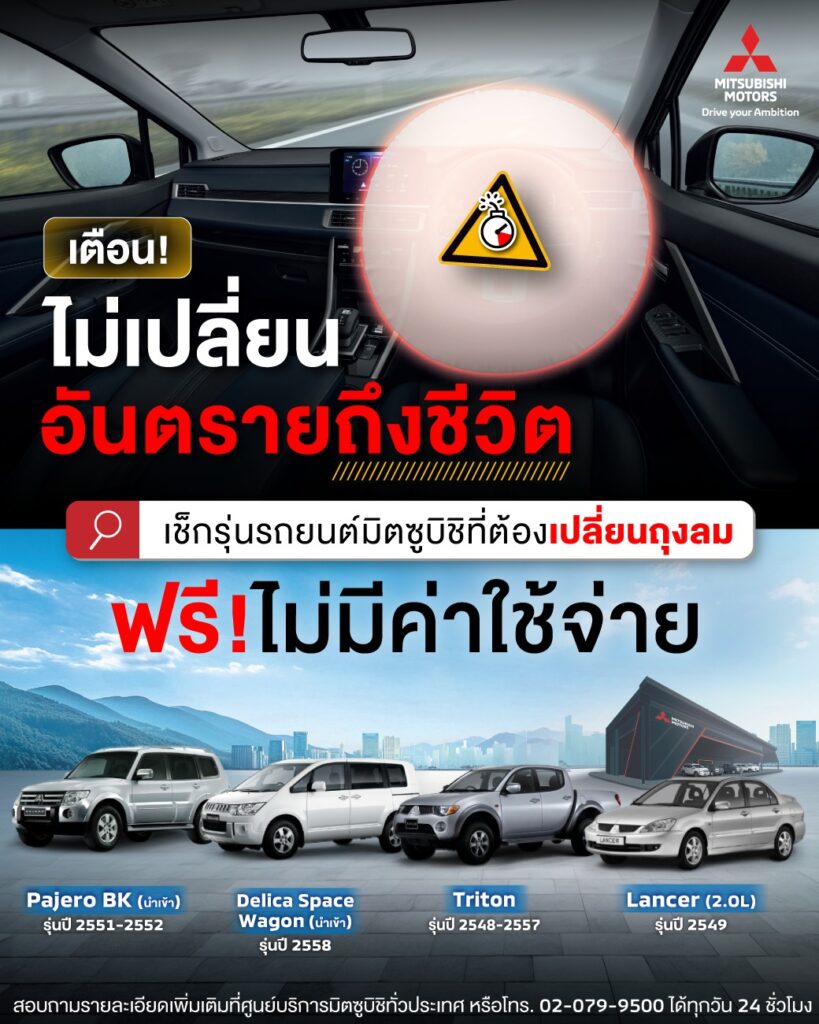 ไม่เปลี่ยนวันนี้ อันตรายถึงชีวิต เพื่อความปลอดภัยของคุณและคนที่คุณรัก เปลี่ยนฟรี! ไม่มีค่าใช้จ่าย ที่ศูนย์บริการมิตซูบิชิทั่วประเทศ สำหรับรถยนต์มิตซูบิชิรุ่นต่างๆ ดังนี้ – มิตซูบิชิ ปาเจโร BK (รถยนต์นำเข้า) รุ่นปี 2551 – 2552 – มิตซูบิชิ เดลิก้า สเปซวากอน (รถยนต์นำเข้า) รุ่นปี 2558 – มิตซูบิชิ ไทรทัน รุ่นปี 2548 – 2557 – มิตซูบิชิ แลนเซอร์ (2.0L) รุ่นปี 2549 หรือตรวจสอบได้ที่ https://mmth.site/3JpHMaX เพียงกรอกหมายเลขตัวถังรถยนต์ของคุณ